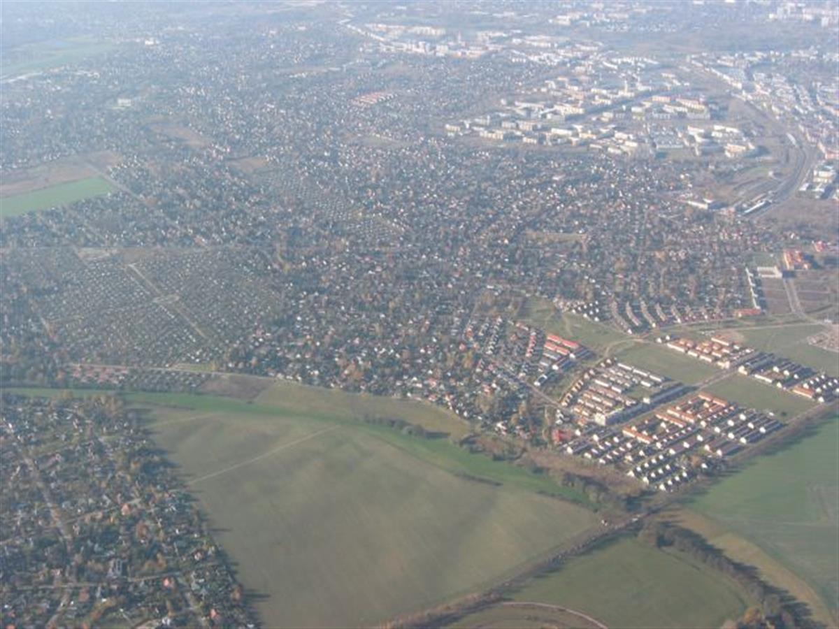 Hönower Siedlung. The structure in the left middle is Mahlsdorf-Nord/Dahlwitzer Straße. To the lower right a part of horse race track Hoppegarten