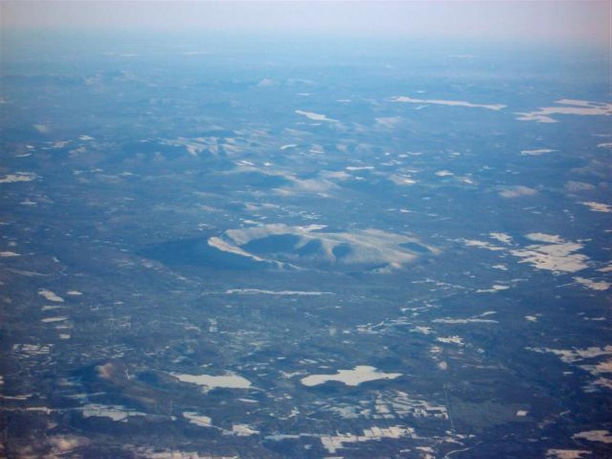 Mount Megantic East of Montreal. I was not able to research whether it is really an impact crater. But there are some traces of impacts and impact crater lakes in this area
