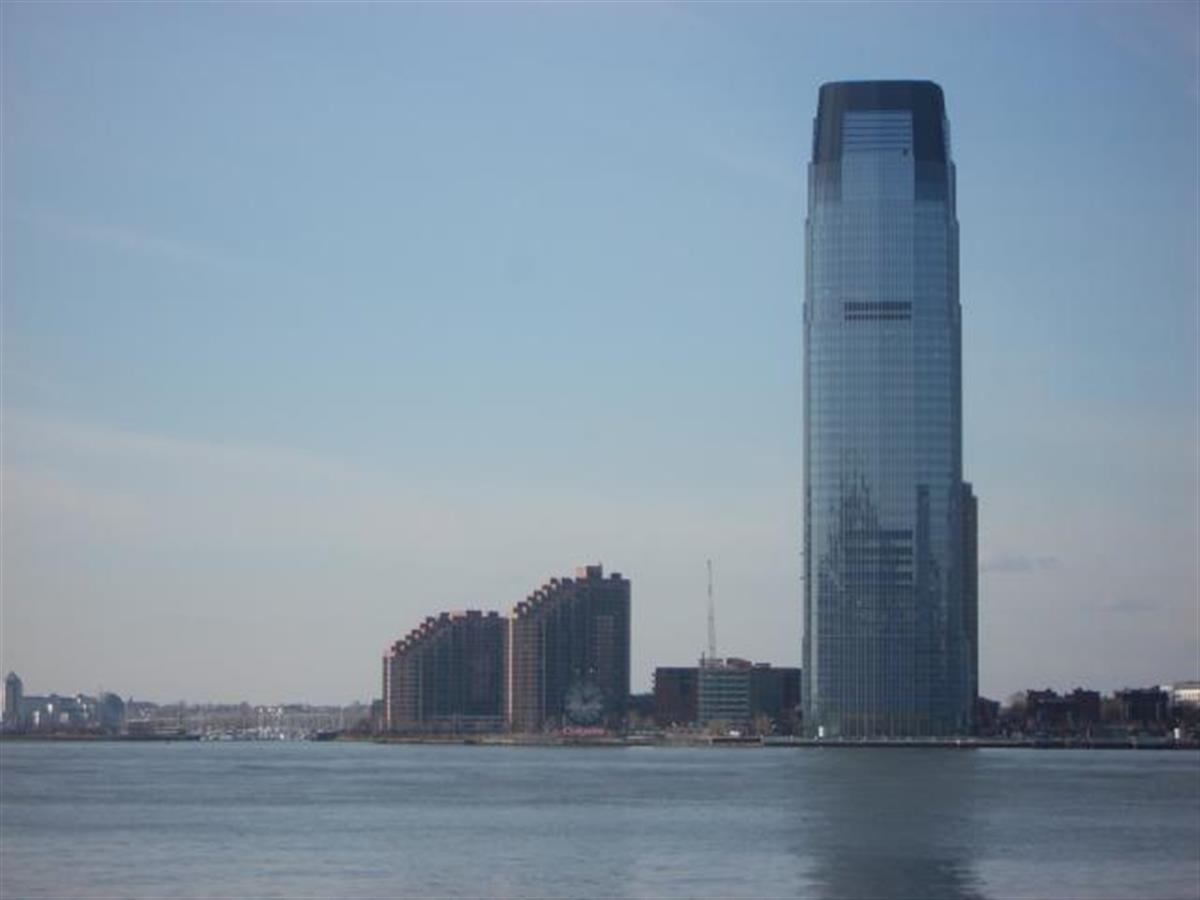 Statue of Liberty. To the right on the other side of river Hudson 30 Hudson Street in New Jersey