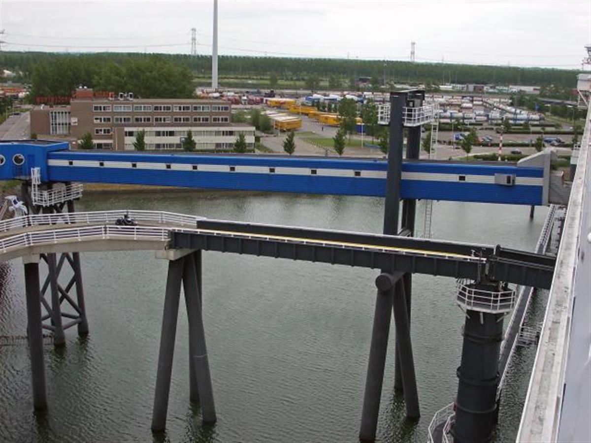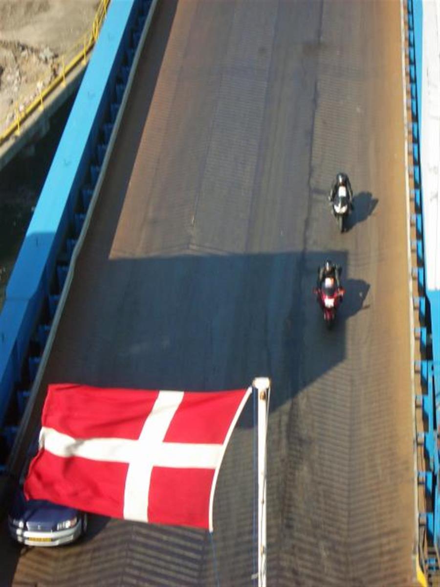 Boarding is ongoing. The narrow bridge high over the water is quite unusual and not so easy to pass for motorbikes