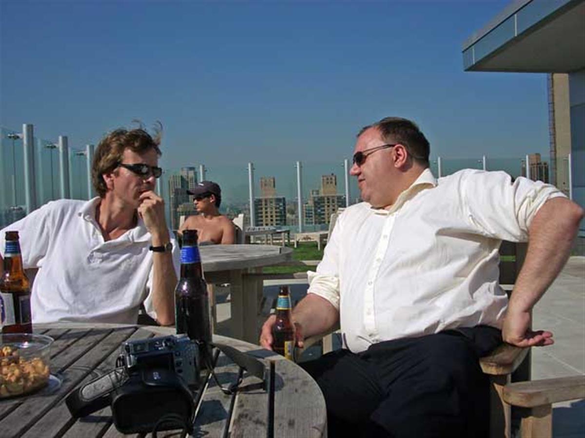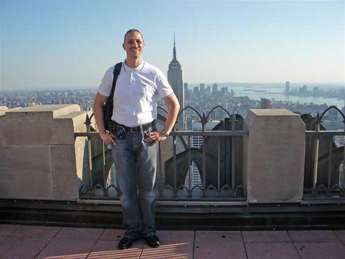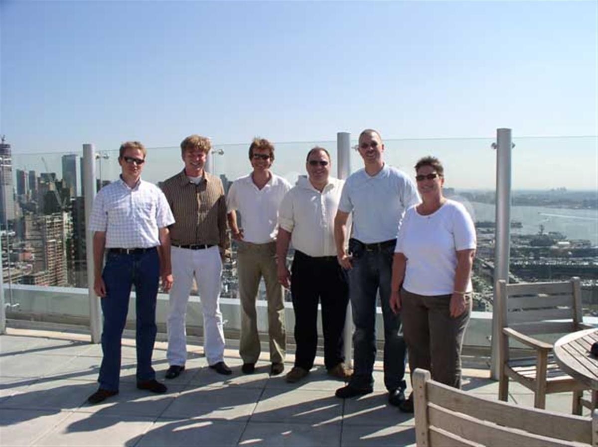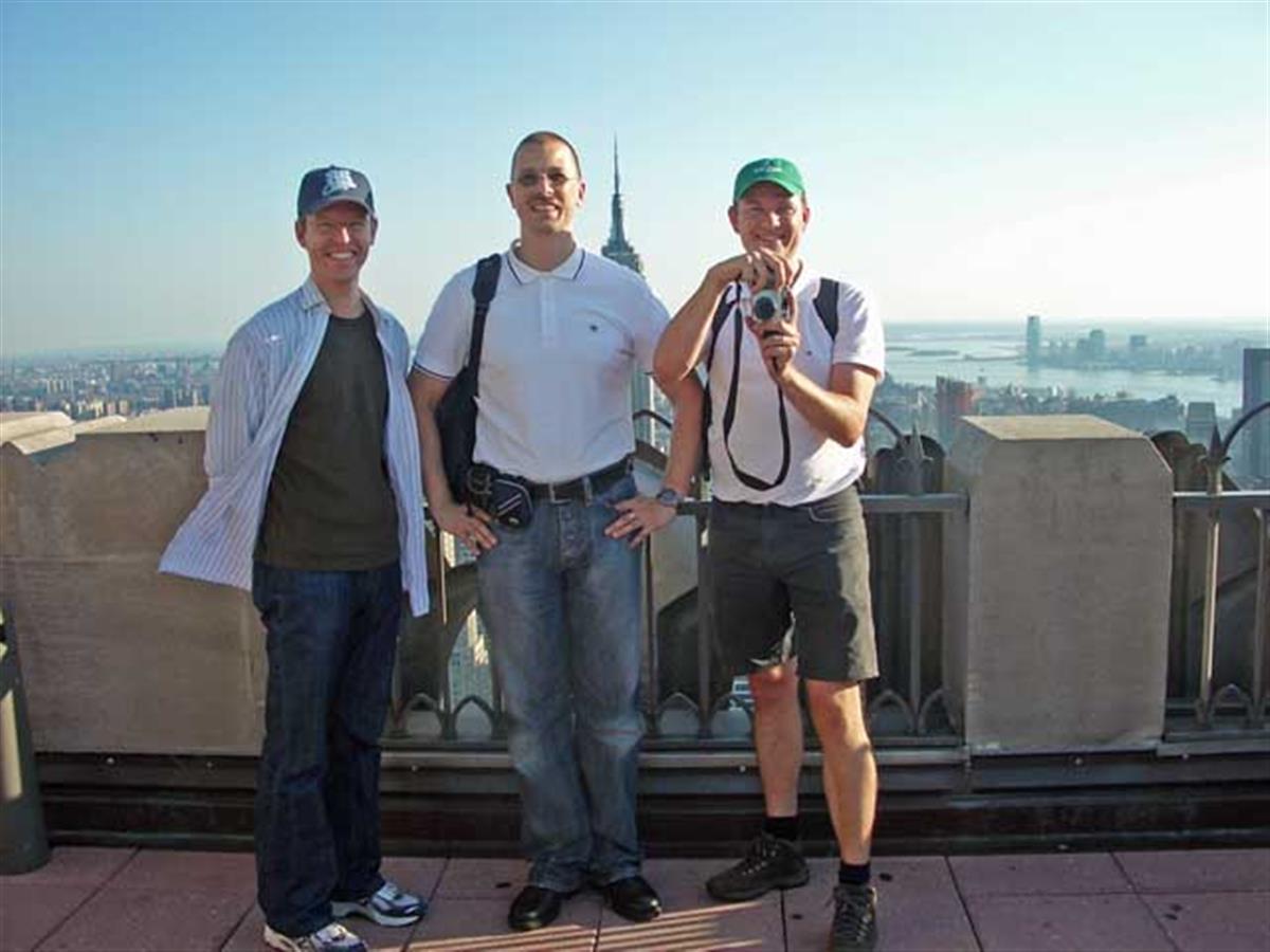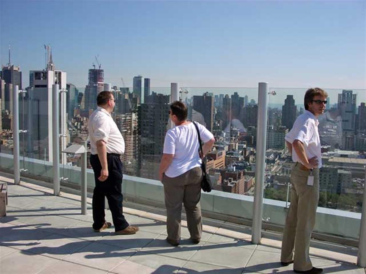 Chris, Margret und Lucas (fltr) enjoy view from roof deck above 44th floor.
