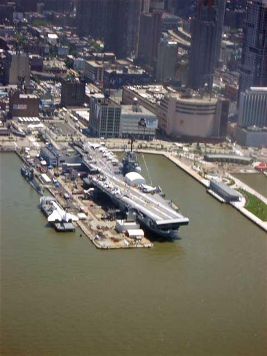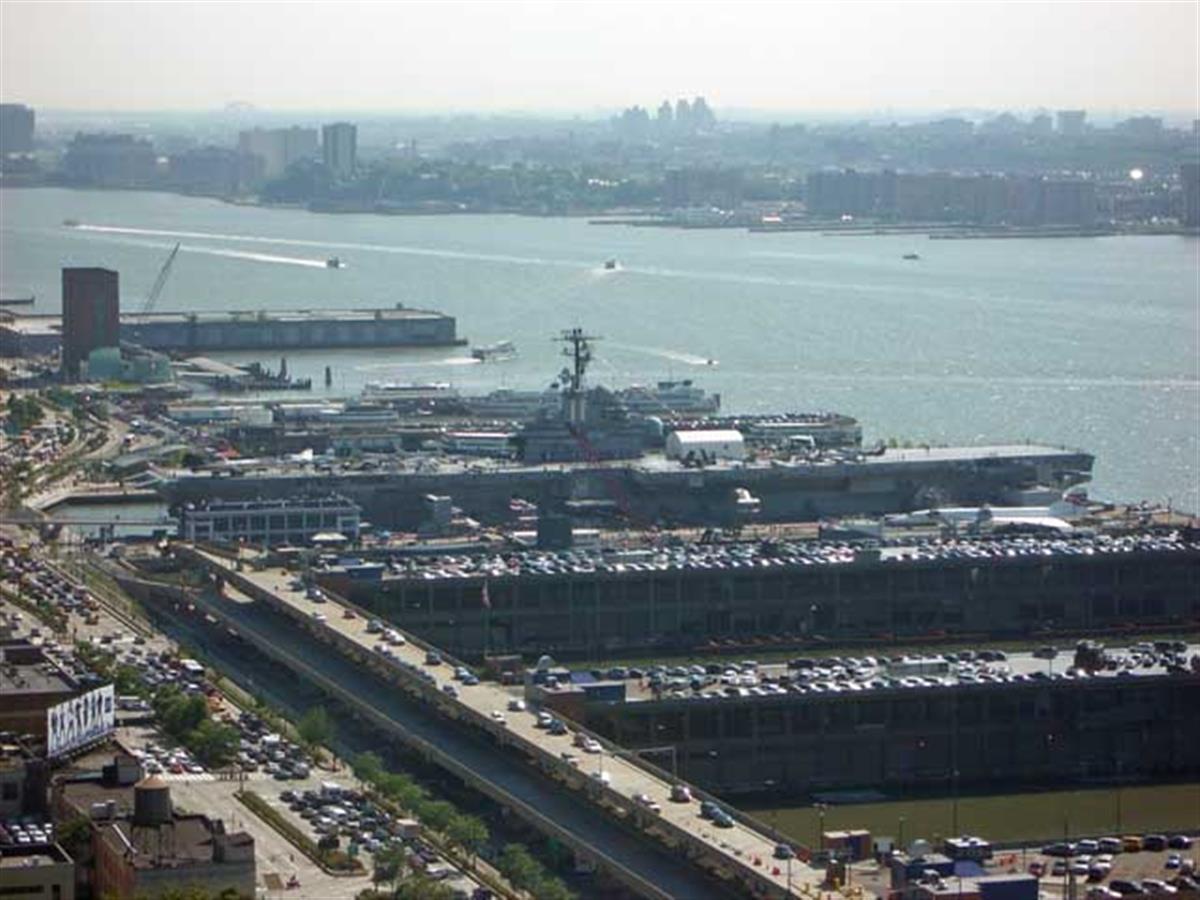 View from roof deck to Sea Air Space Museum at USS Intrepid and British Airways Concorde...