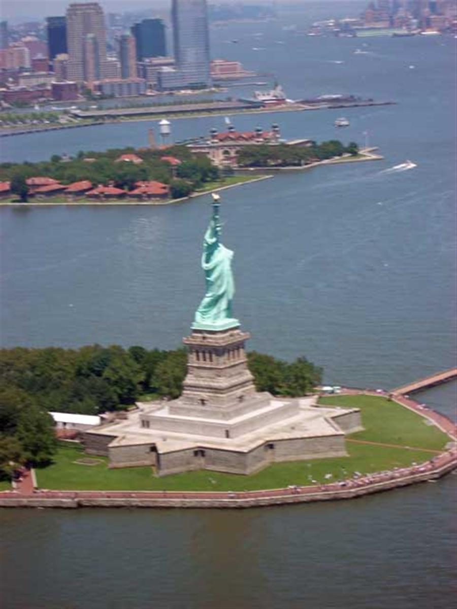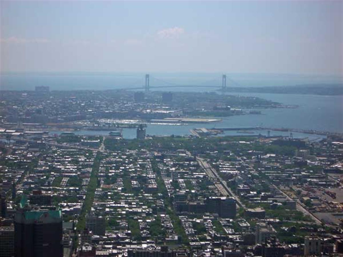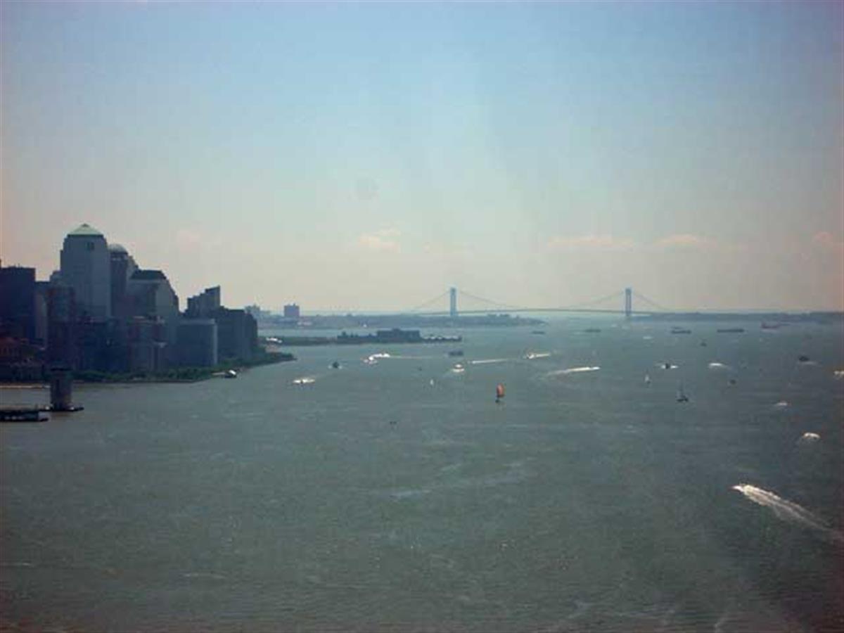 View to Lower Manhattan including Verrazano Narrows Bridge to the left and Statue of Liberty to the right.