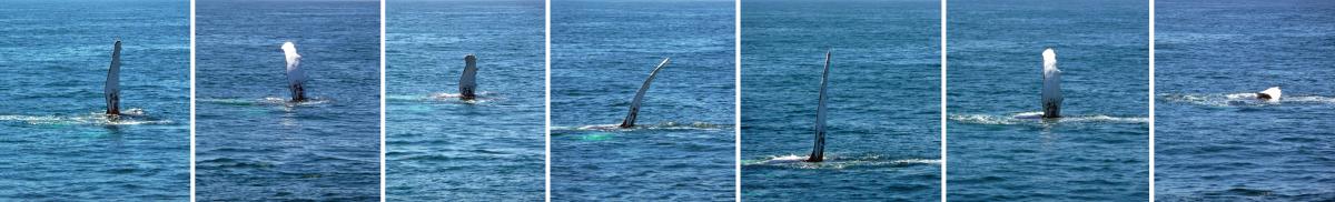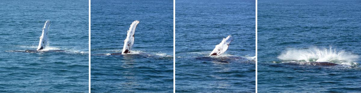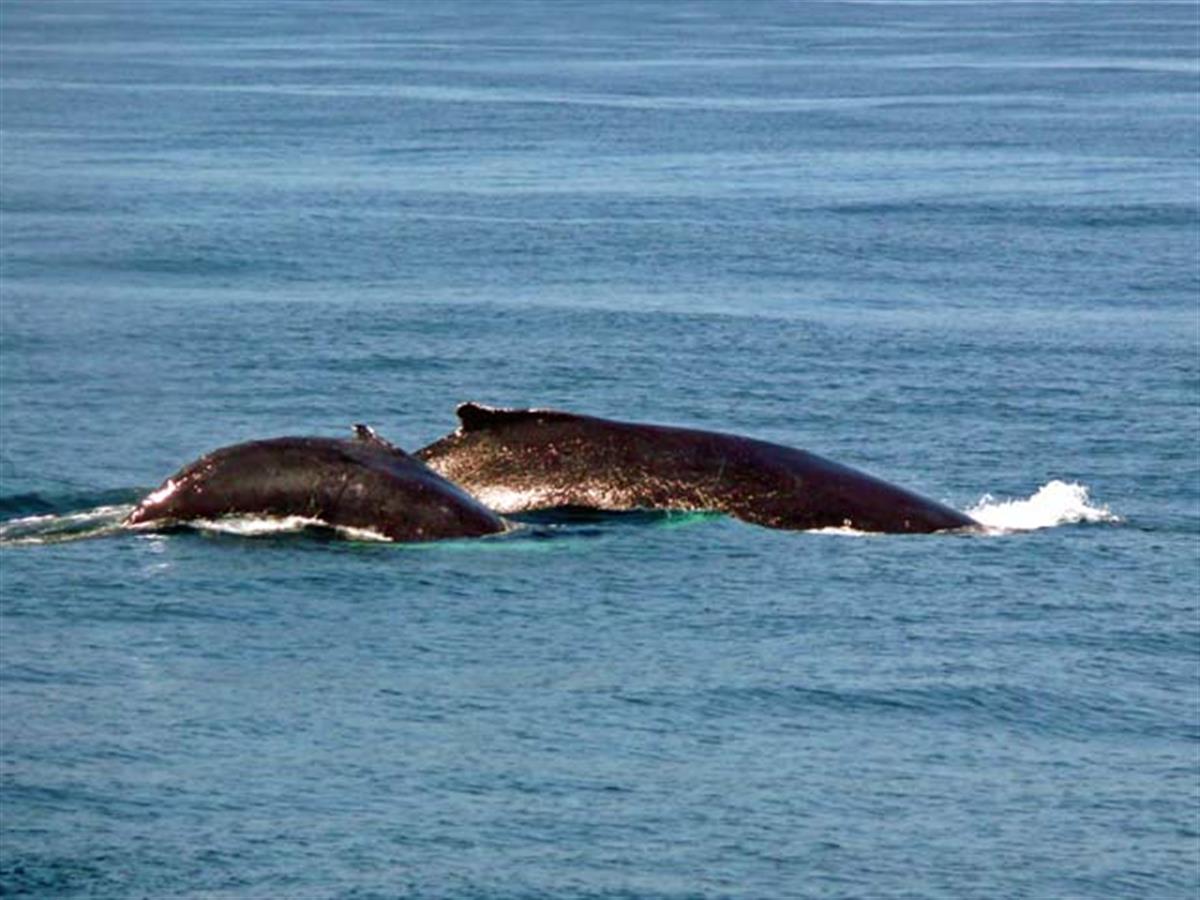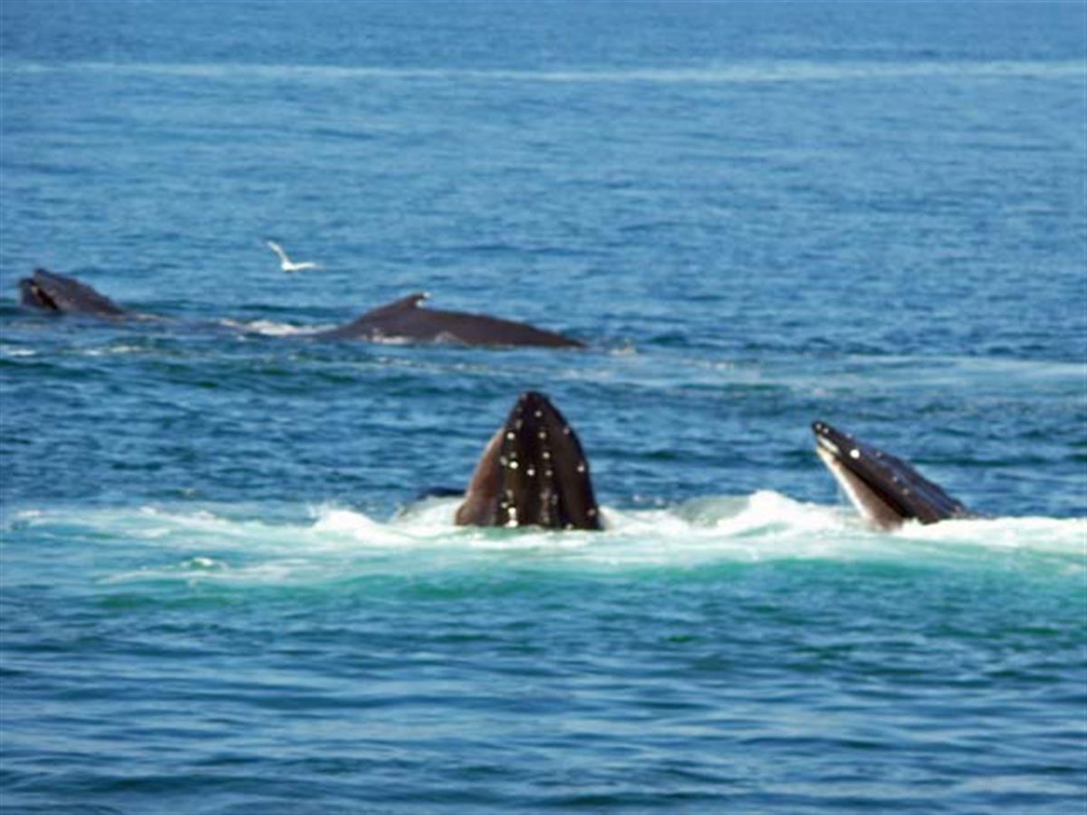 We just left the harbor and we spot whales. In this case humpback whales. They have their mouth wide open, swim through the water and eat.