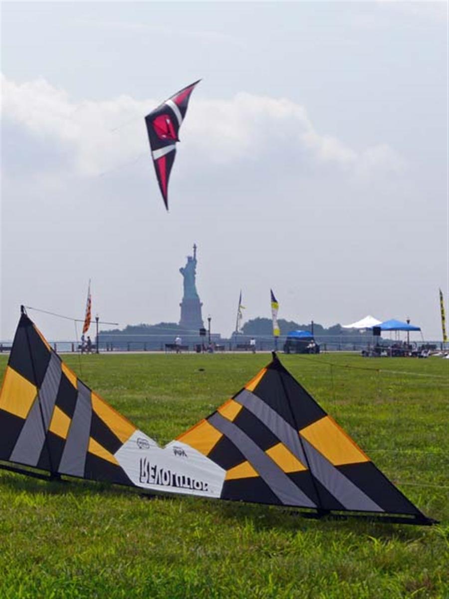We watch a stunt kite competition in Liberty State Park. The kites fly with music and follow a choreography.