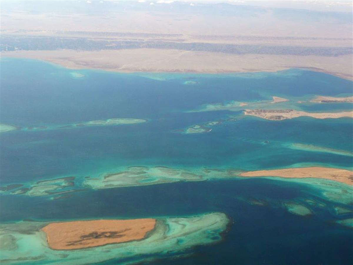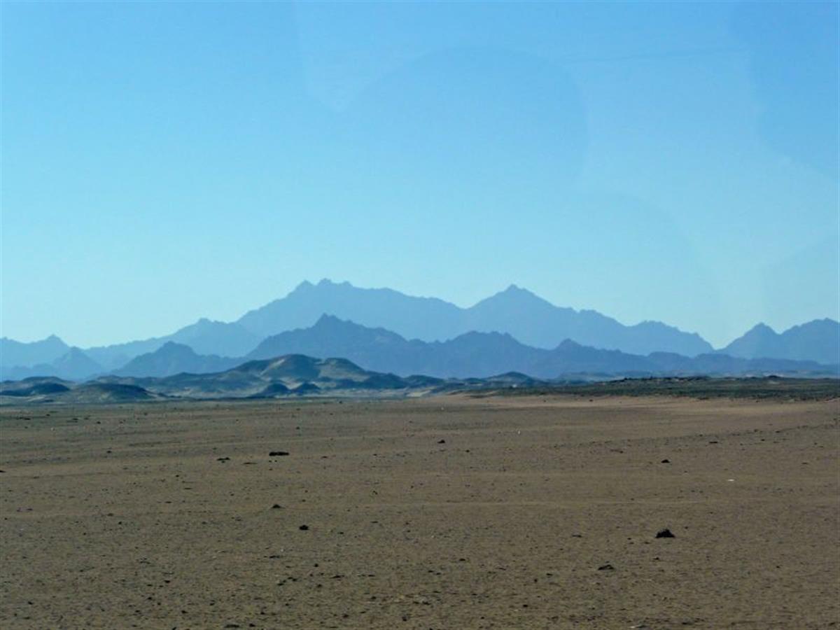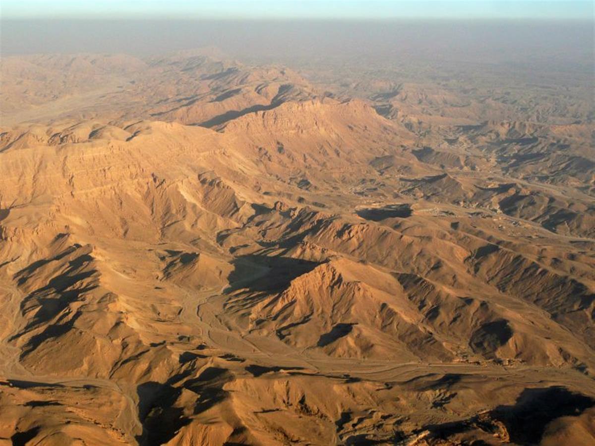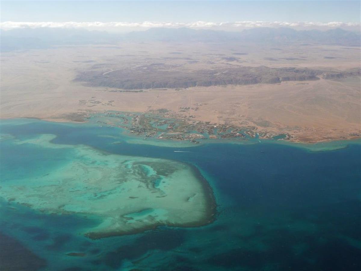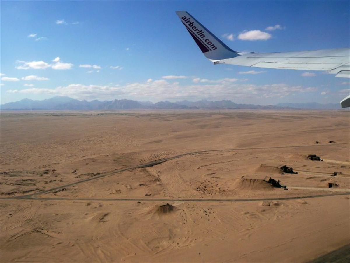 Desert and Red Sea mountians shortly after take-off. One can see the shelters of the military part of Hurghada airport