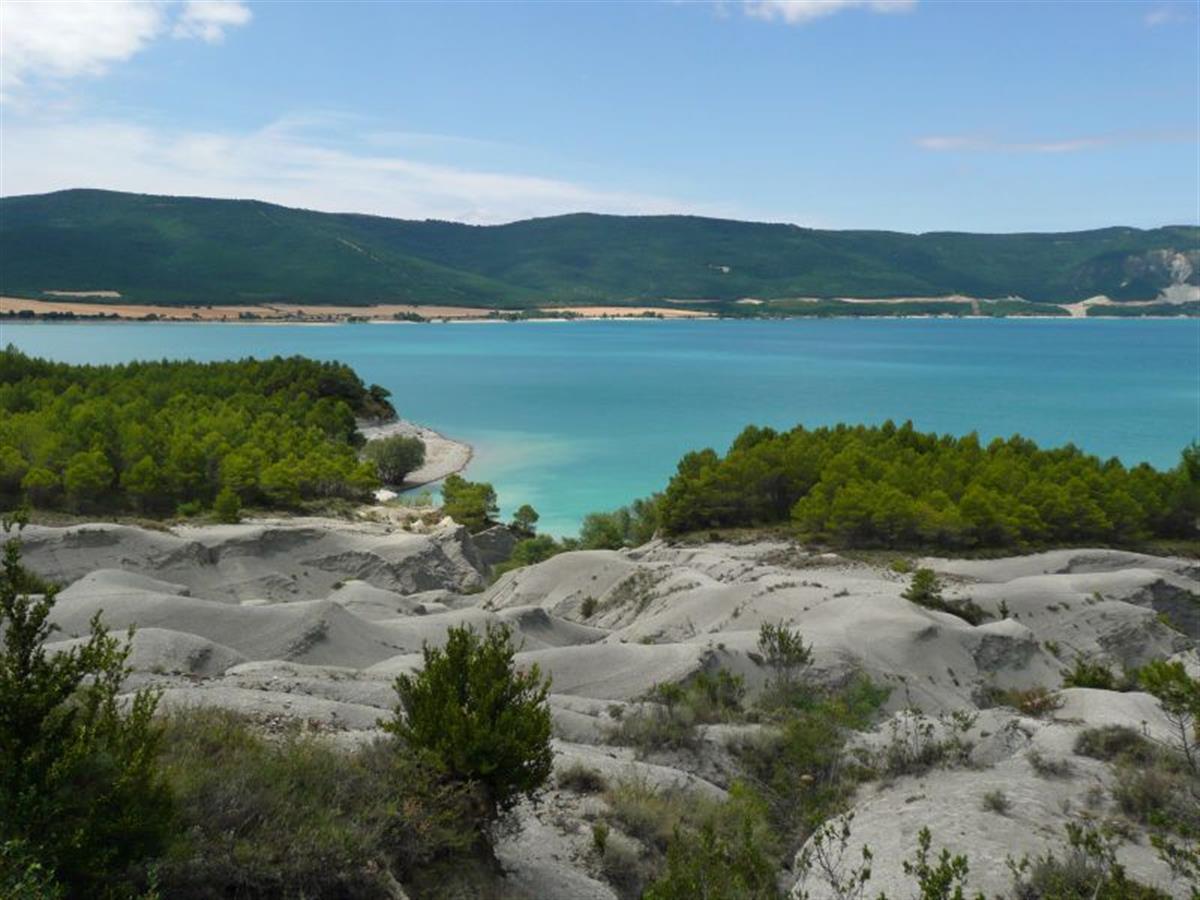 A reservoir with very blue water in it