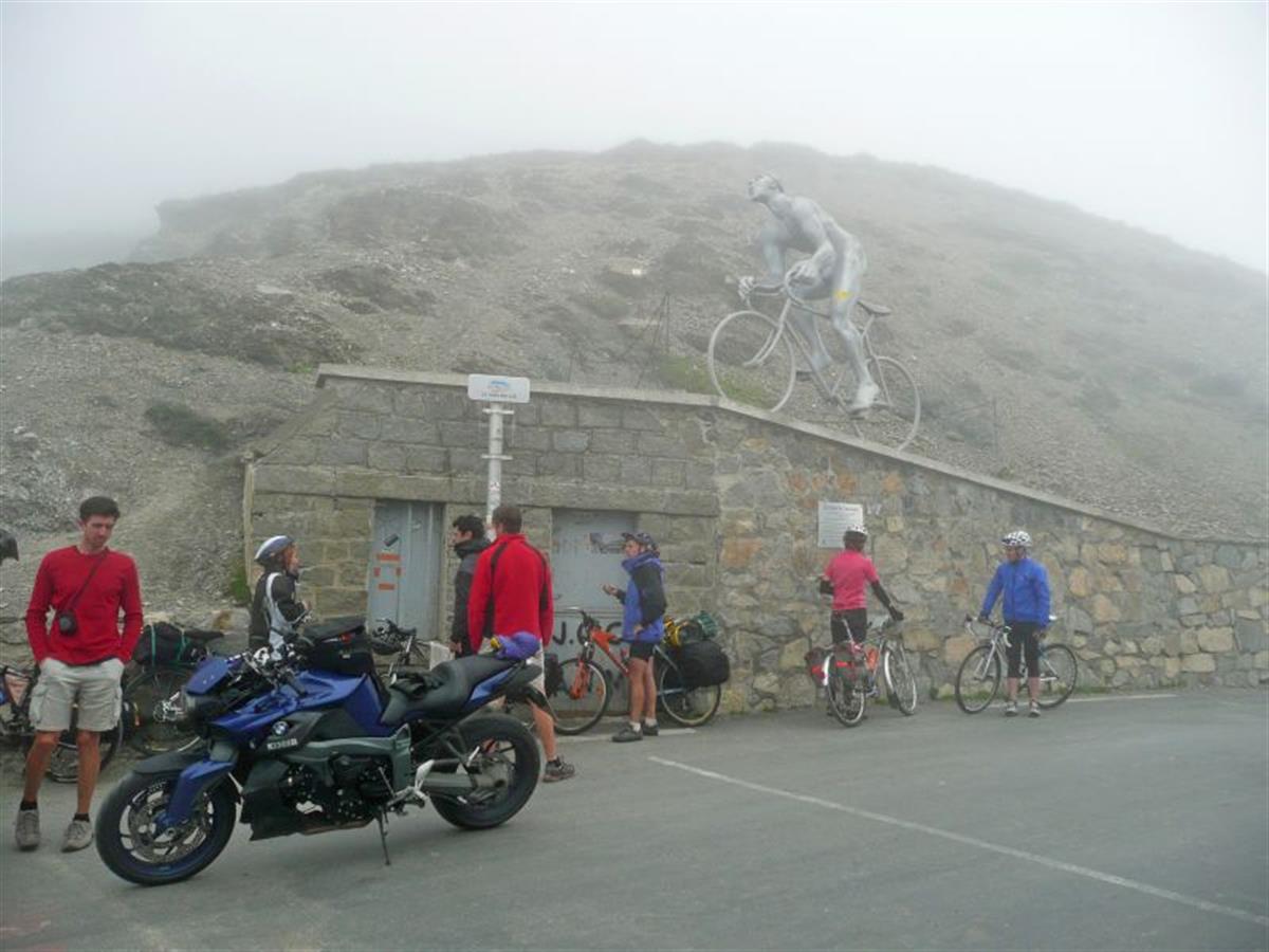 The summit. A bicycle rider monument, hundreds of cyclists and due to the clouds nothing to see