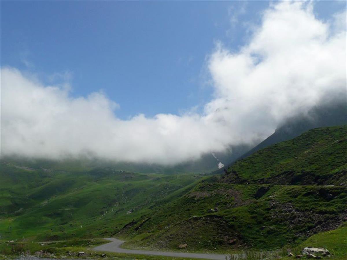 View from Tourmalet eastern ramp. The clouds are hanging low and we expect not to see much on top of the pass