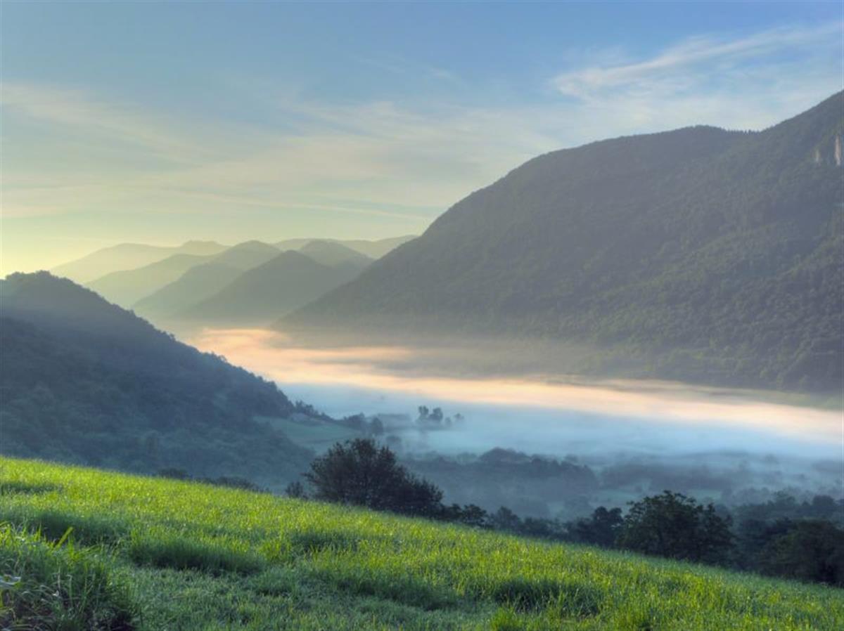 Morning fog in the valey is hit by the fist sun beams (HDR picture).