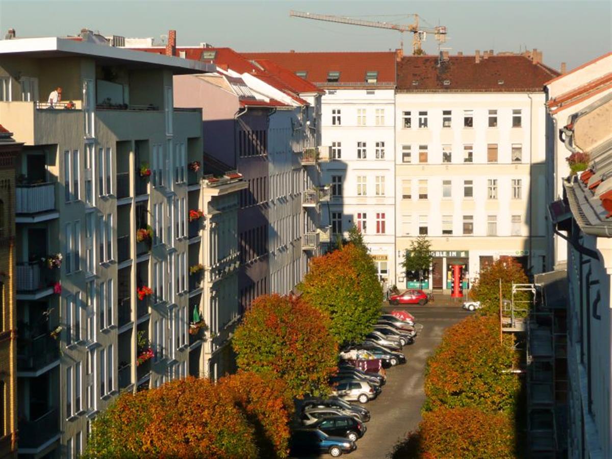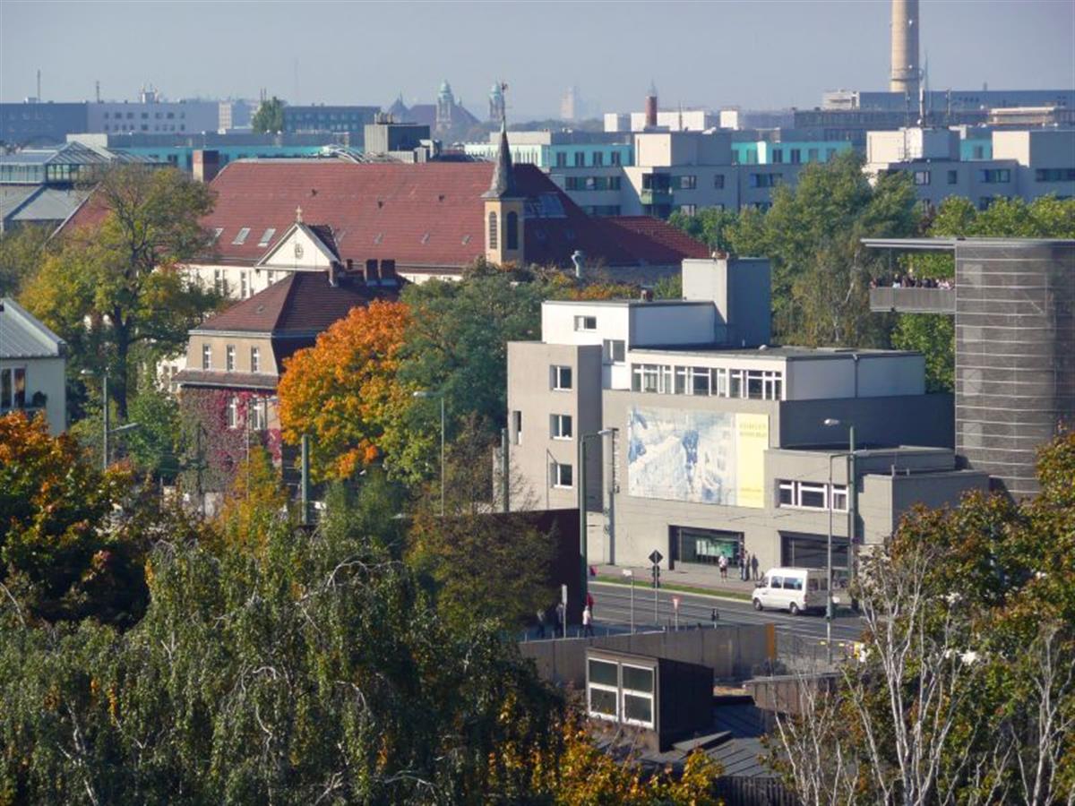 Still from my apartment: View to the Berlin Wall Memorial Information centre (gray building with the big black&white picture on it)