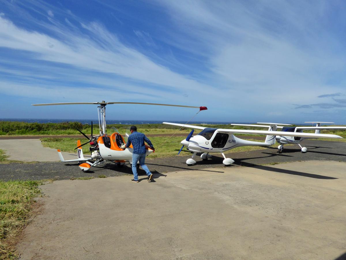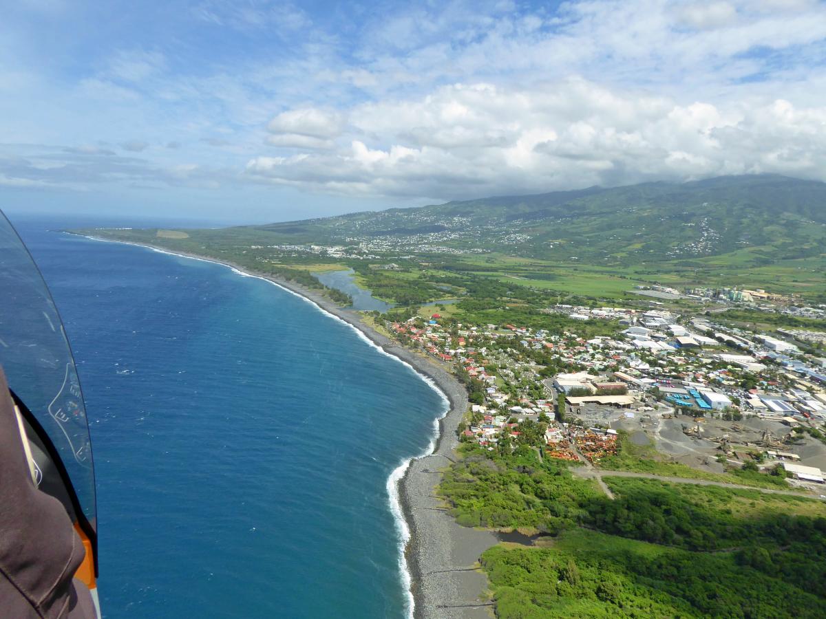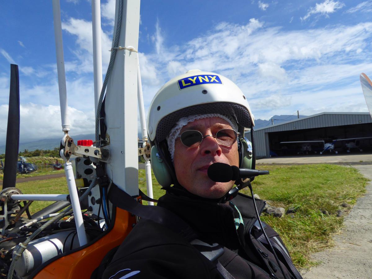 I fly with a gyrocopter with Zen Altitude ULM in Saint Piere (Pierrefond). The gyrocopter is an ELA 07 Cougar. Quite exciting. I have not done it before. We fly along the coast line as a circle around the volcano does not work due to the weather conditions.