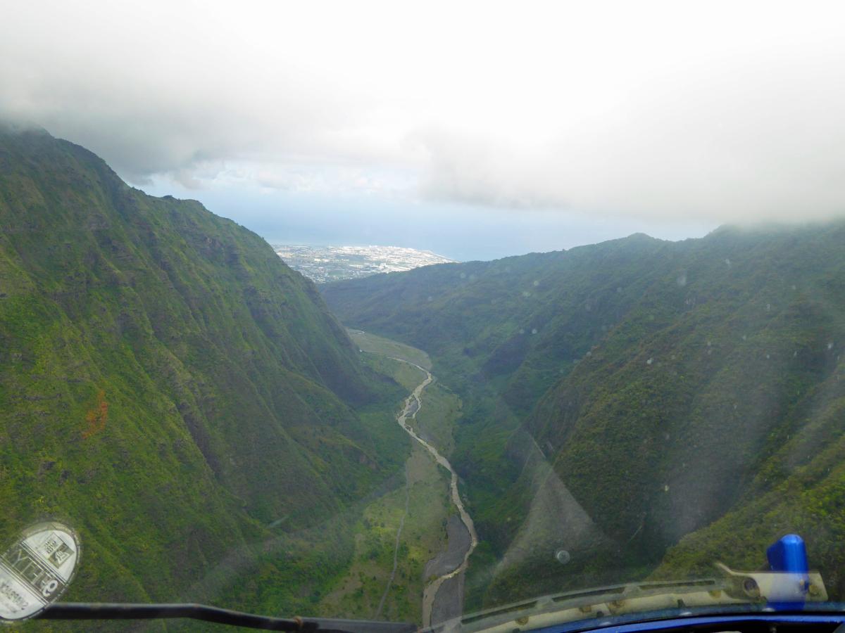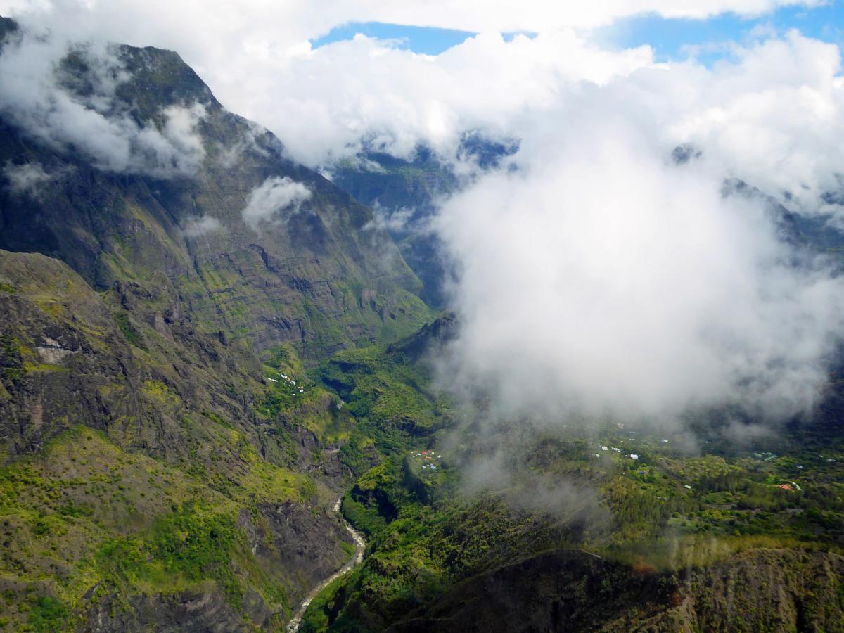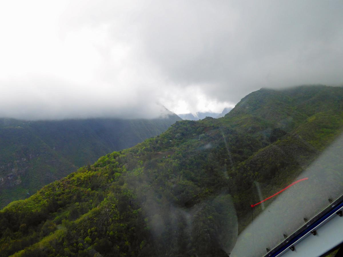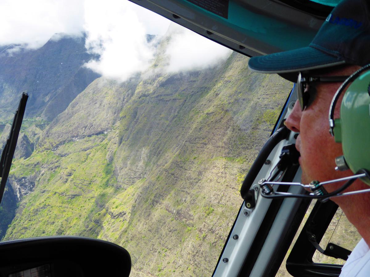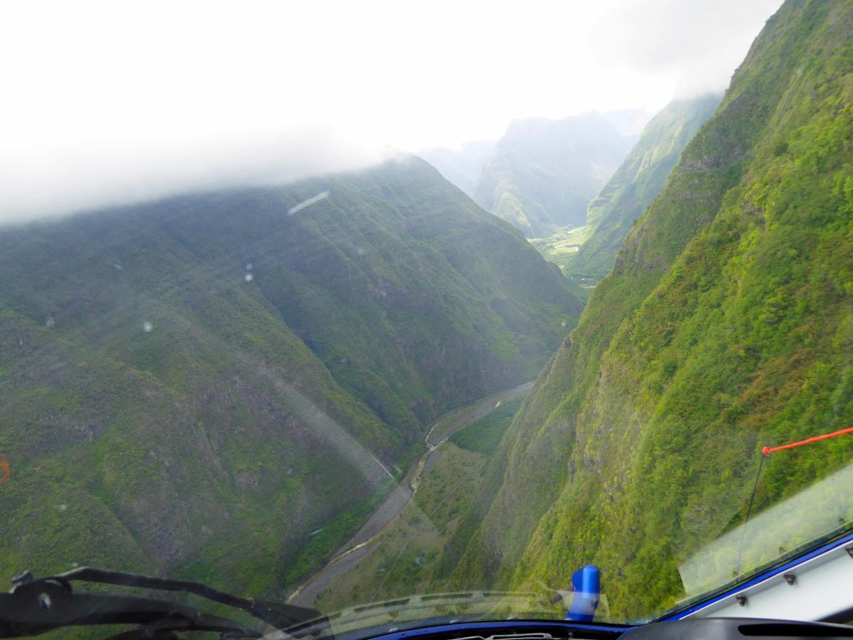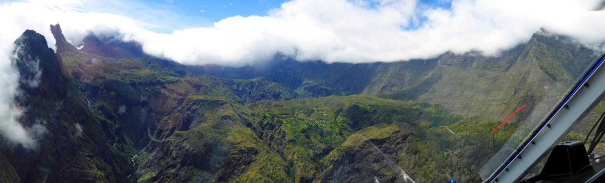 We fly with Helilagon. The weather prevents again a flight around the active volcano and we do a loop into Cirque de Mafate instead.