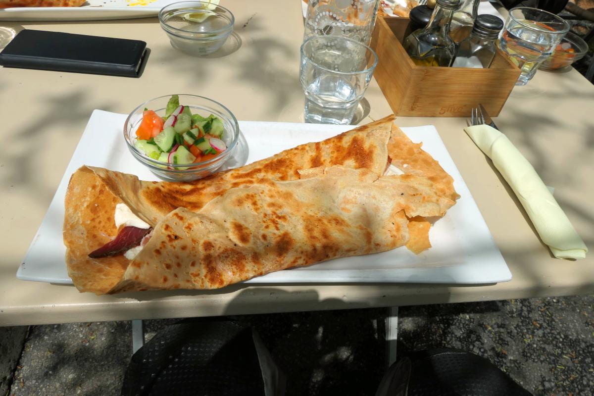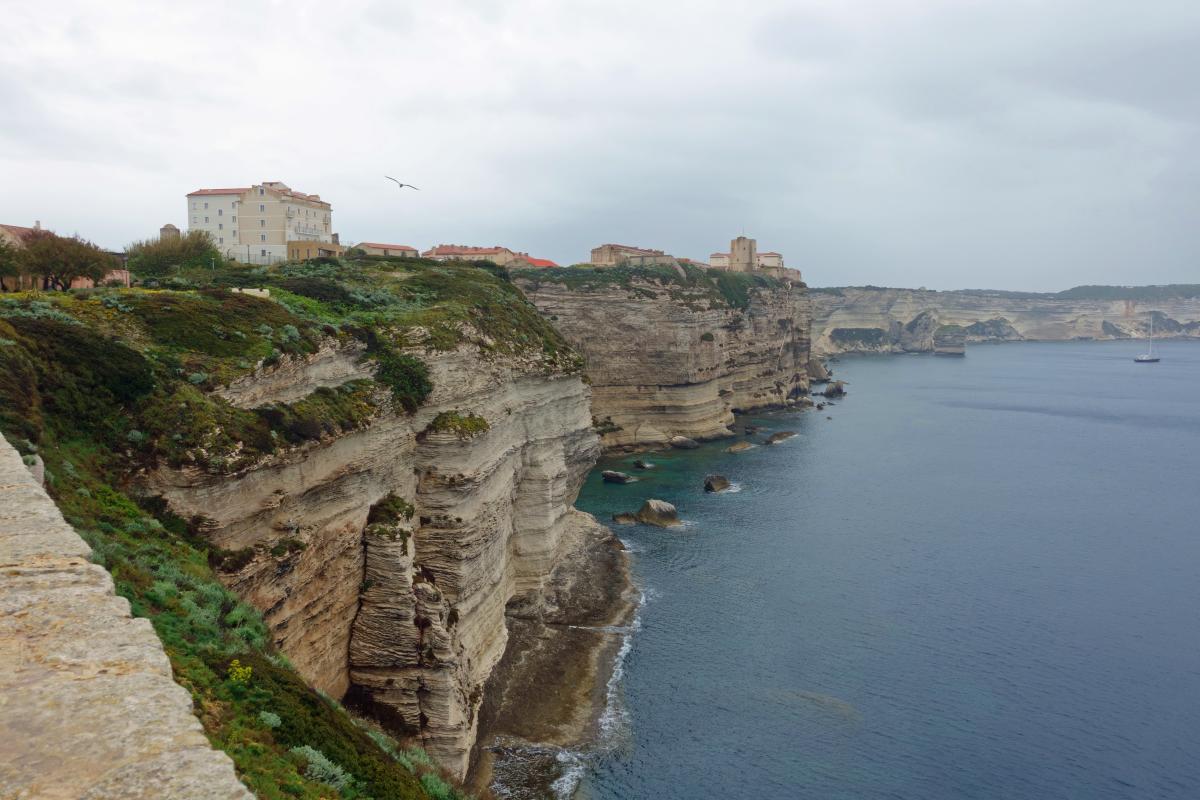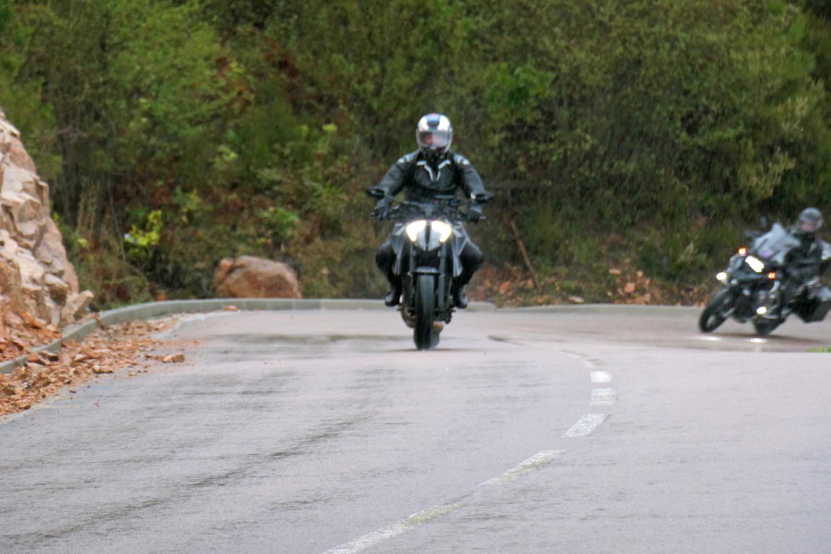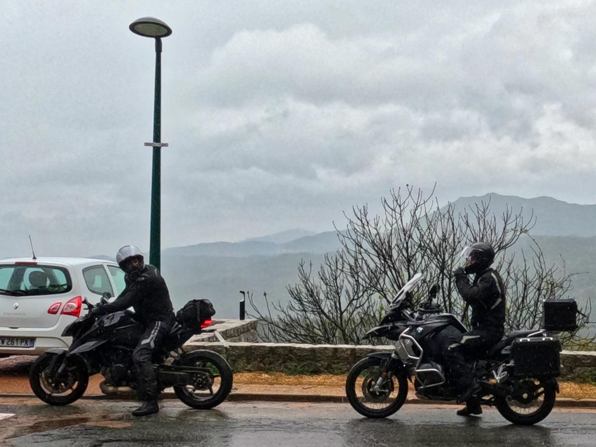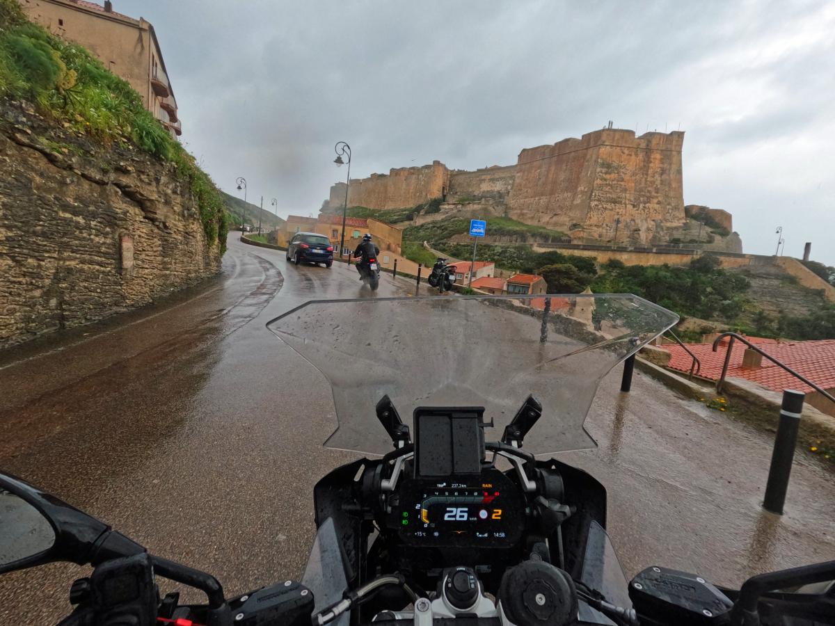 The rain continues. According to the move of the rain areas, we reverse our planned loop. Successfully: We even have dry roads in between. However, it rains properly at the beginning and when we reach our main destination Bonifacio it is pouring.