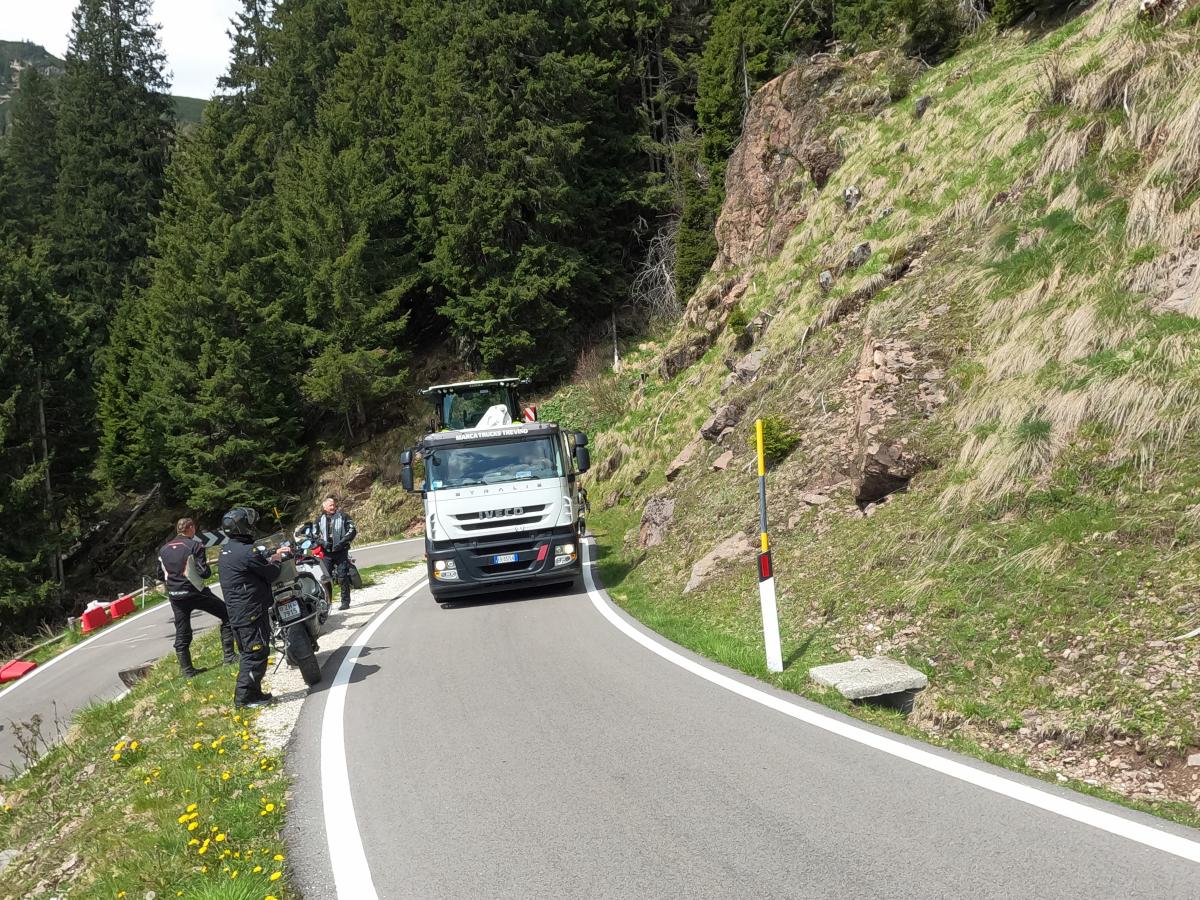 The Passo Manghen has a special adventure waiting for us: the road is blocked by a truck that got stuck in a hairpin turn. It takes a while until it gets free again.
