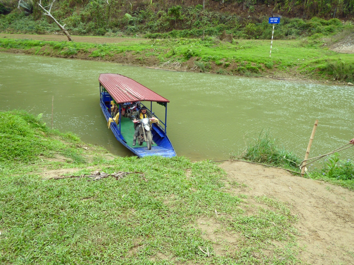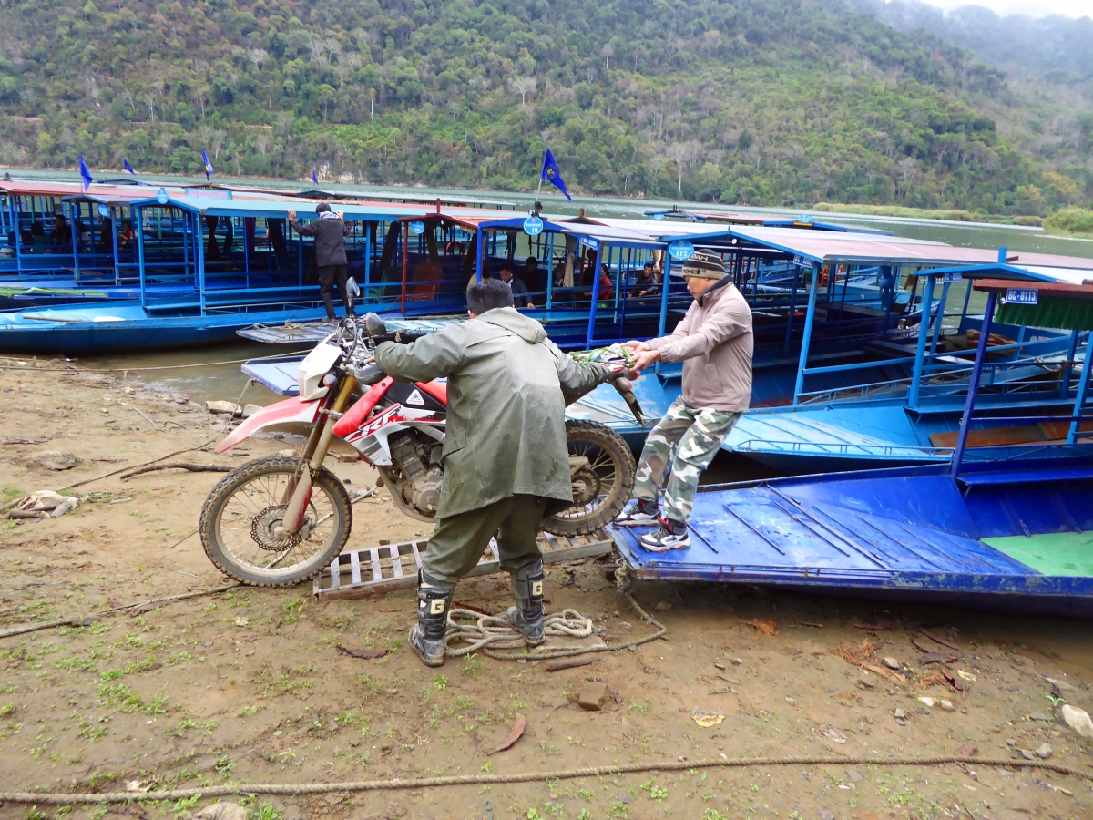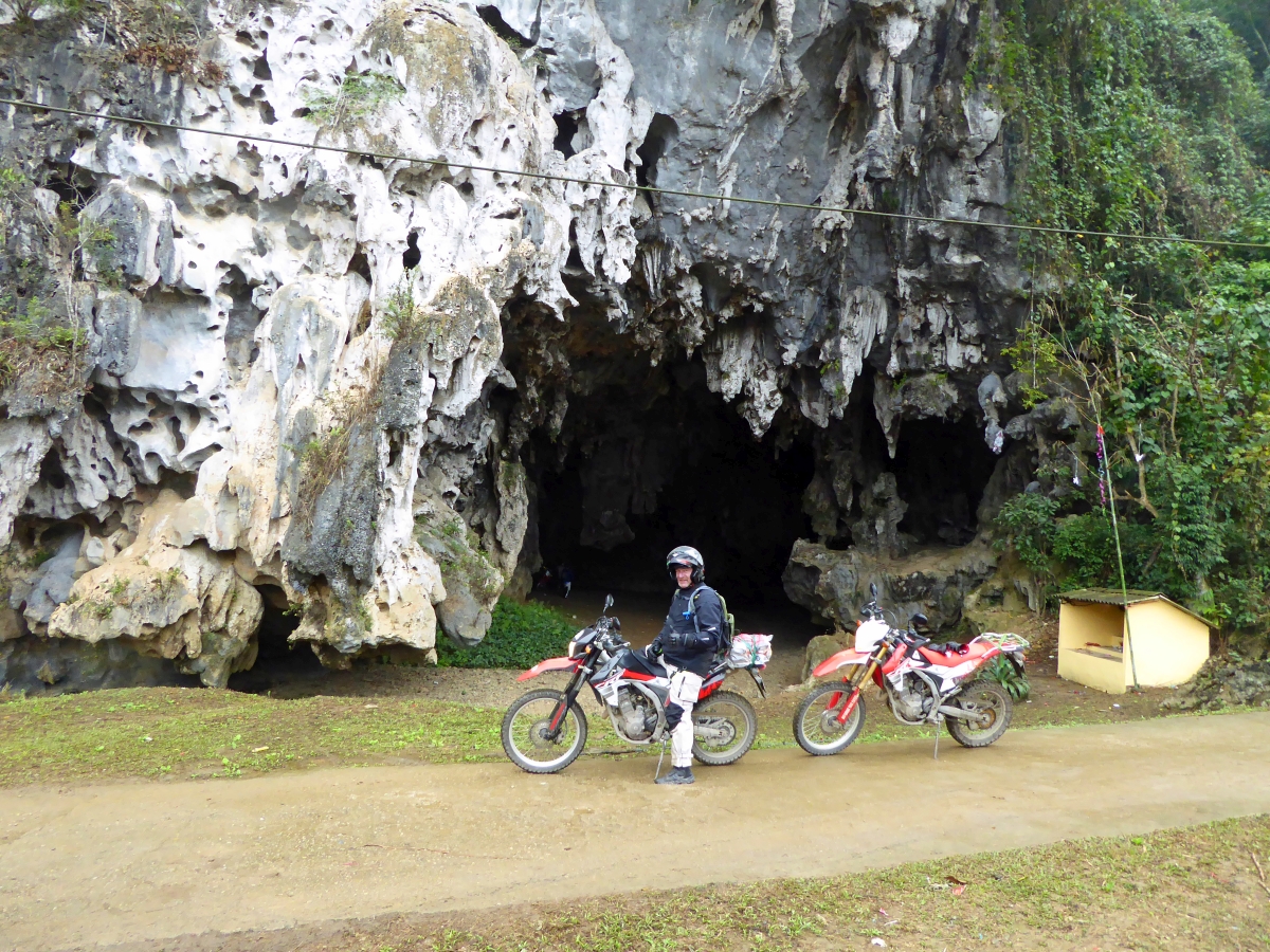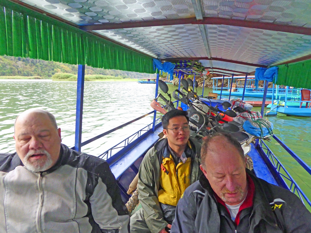Something else very special. We drive across Lake Ba Bé into a river and through a cave. The bikes are on a small boat, as we are.