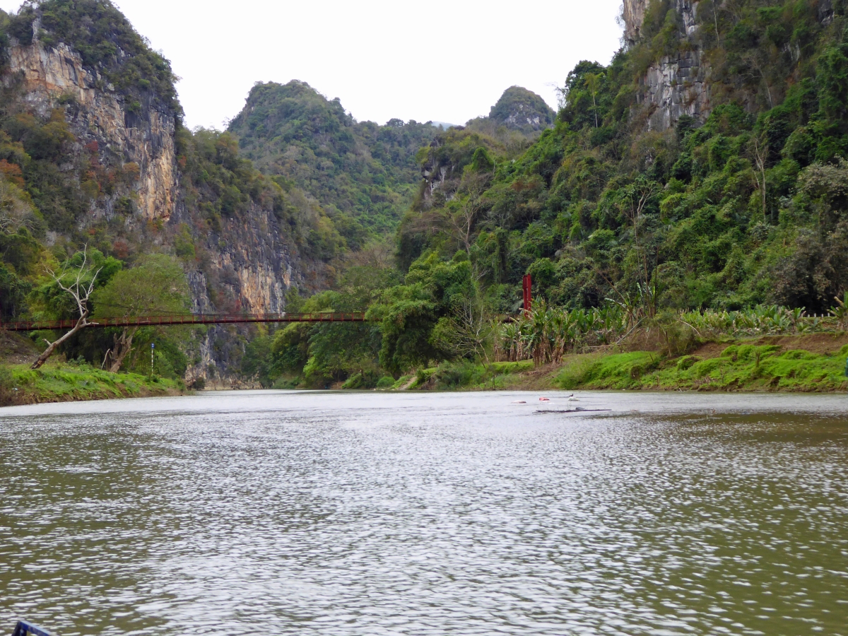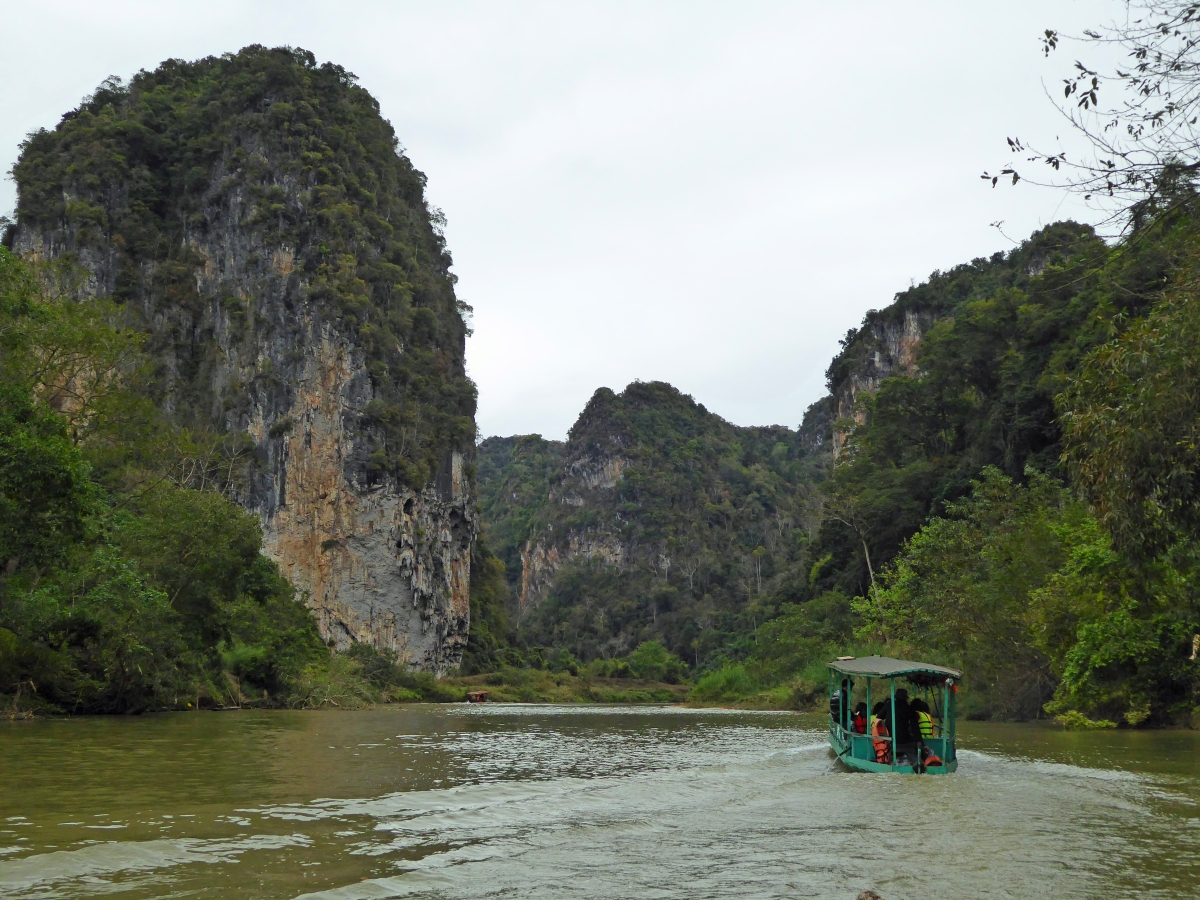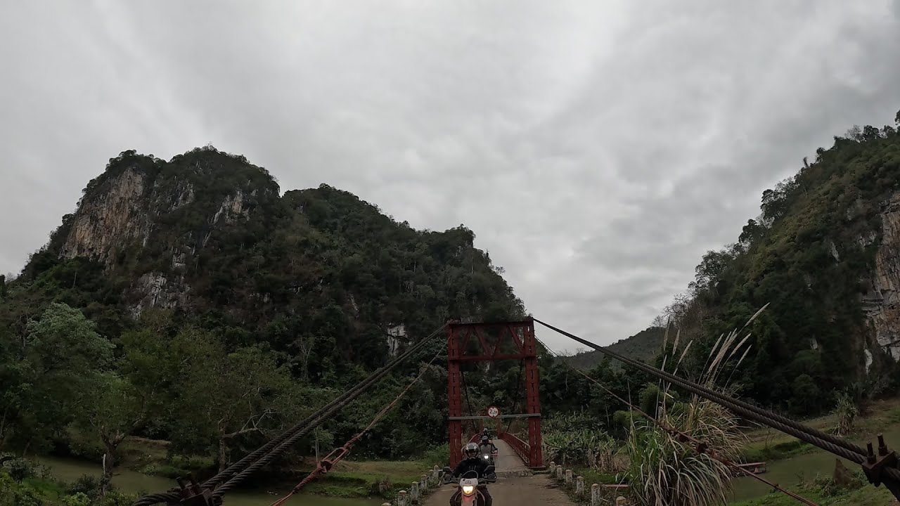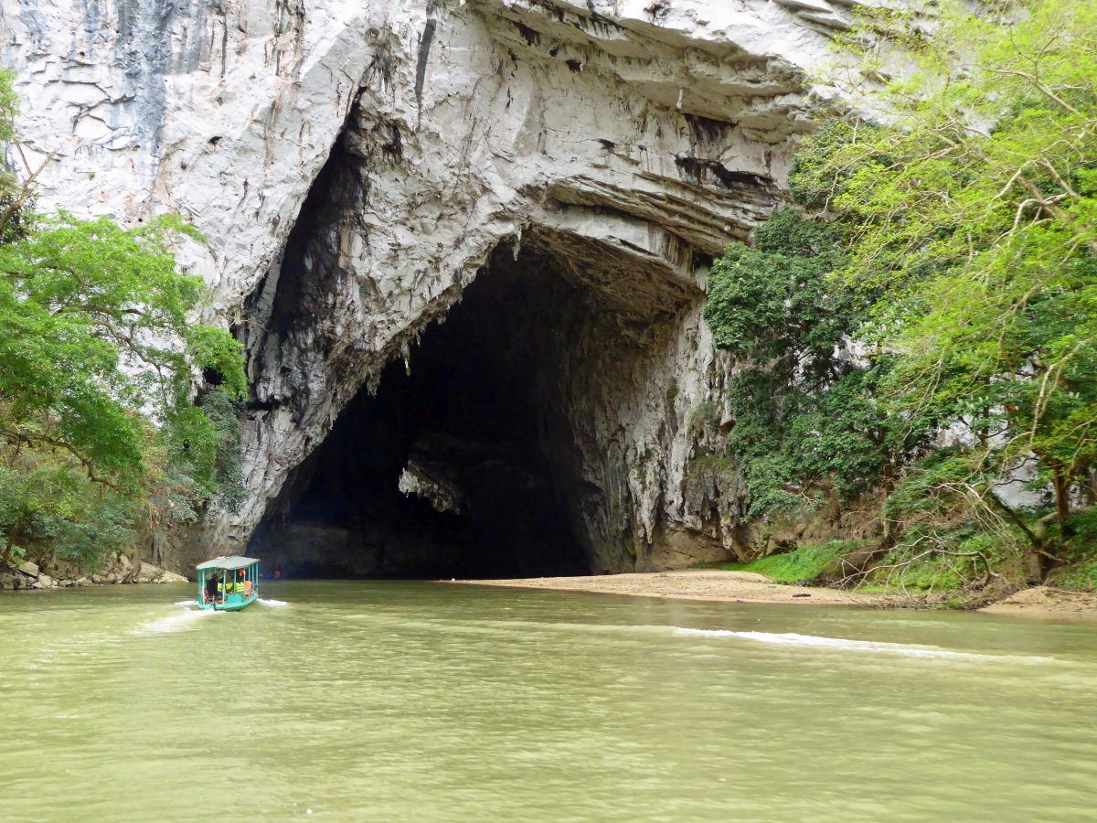 Something else very special. We drive across Lake Ba Bé into a river and through a cave. The bikes are on a small boat, as we are.