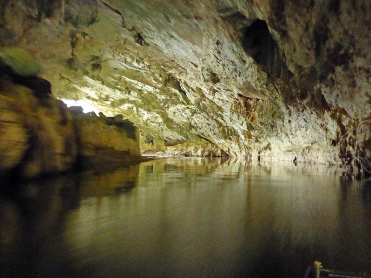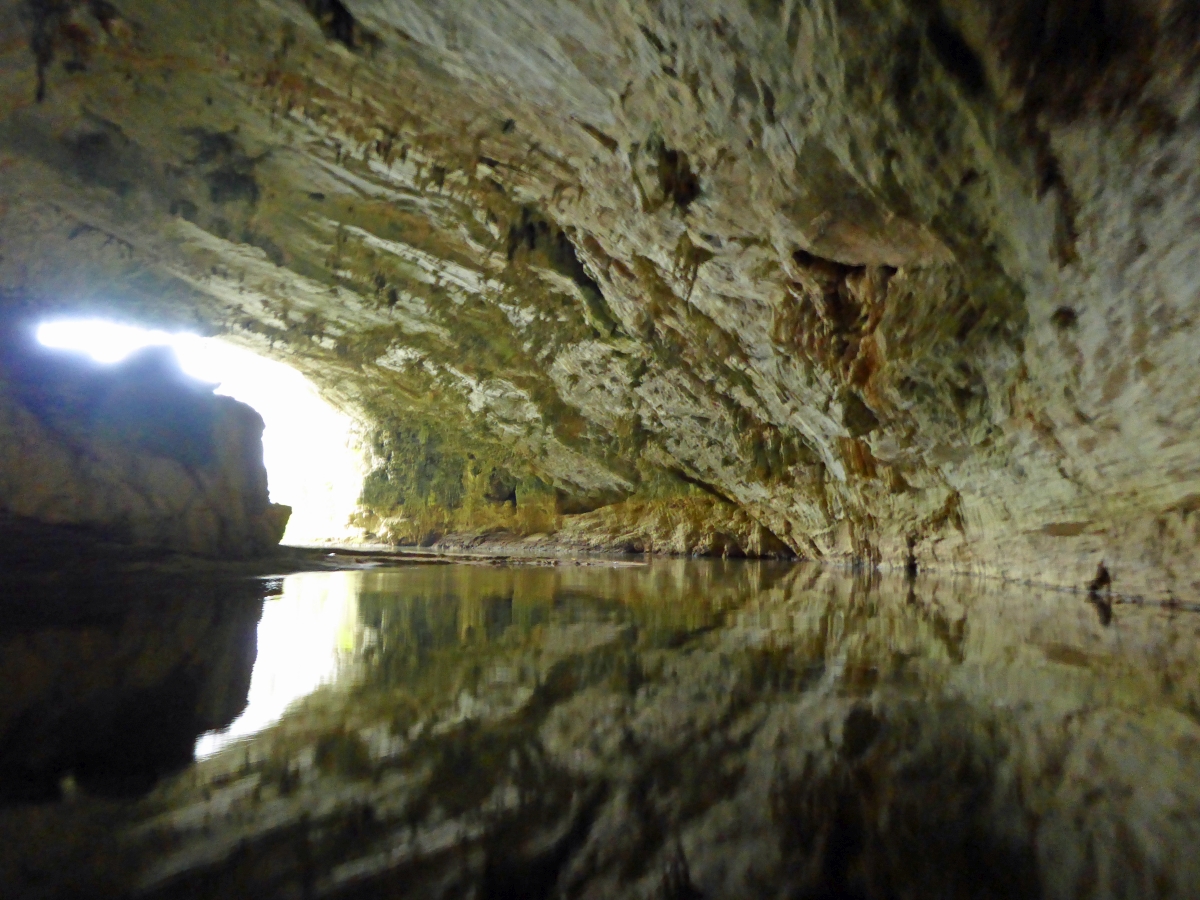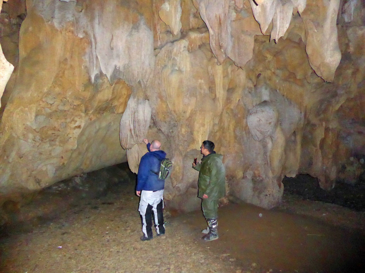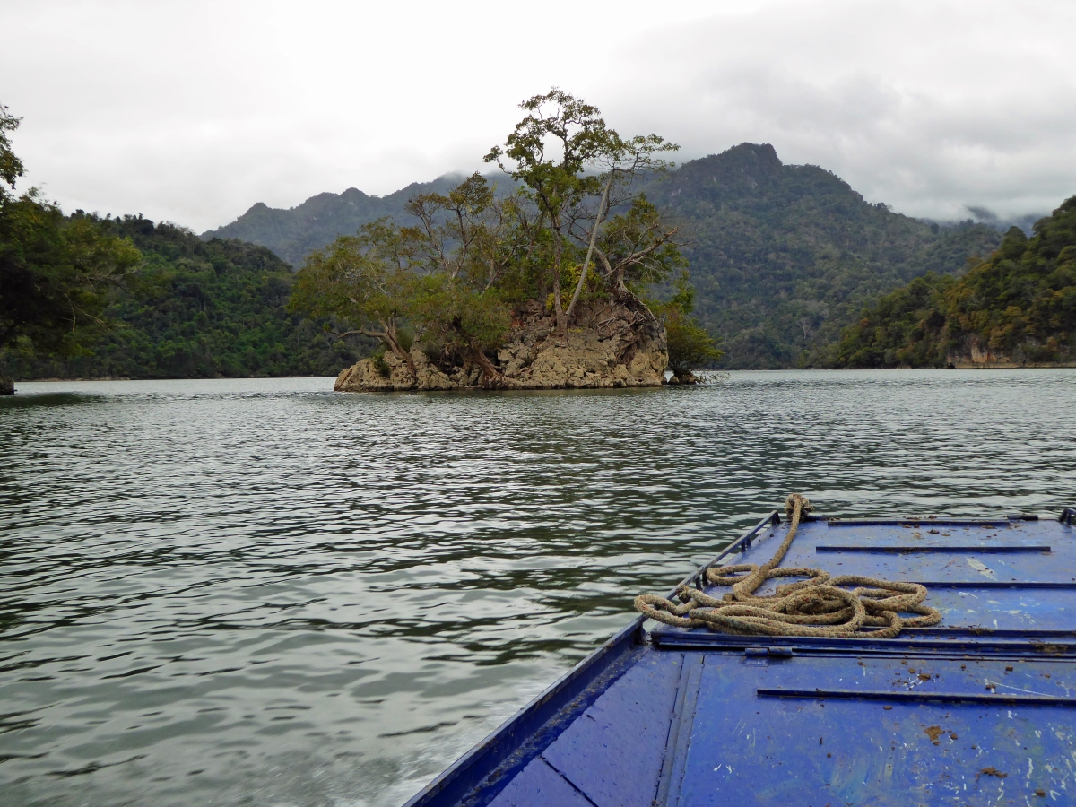 Something else very special. We drive across Lake Ba Bé into a river and through a cave. The bikes are on a small boat, as we are.